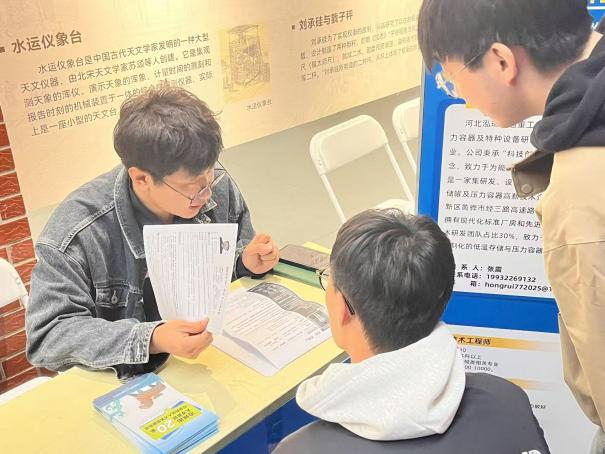 此次招聘会有河北宏泰专用汽车有限公司、河北赛德生物科技有限公司等25家优质企业参展。双选会现场气氛热烈,参会单位前人头攒动,毕业生们带着精心准备的简历积极了解各企业招聘岗位信息及用人要求,努力寻求心仪岗位。不少非毕业年级同学也参与其中,以更好了解市场动态和用人单位需求,积累经验、提前规划自身职业发展。招聘企业向咨询毕业生耐心介绍企业情况、工作环境、薪资待遇、晋升制度等,现场互动十分火热。