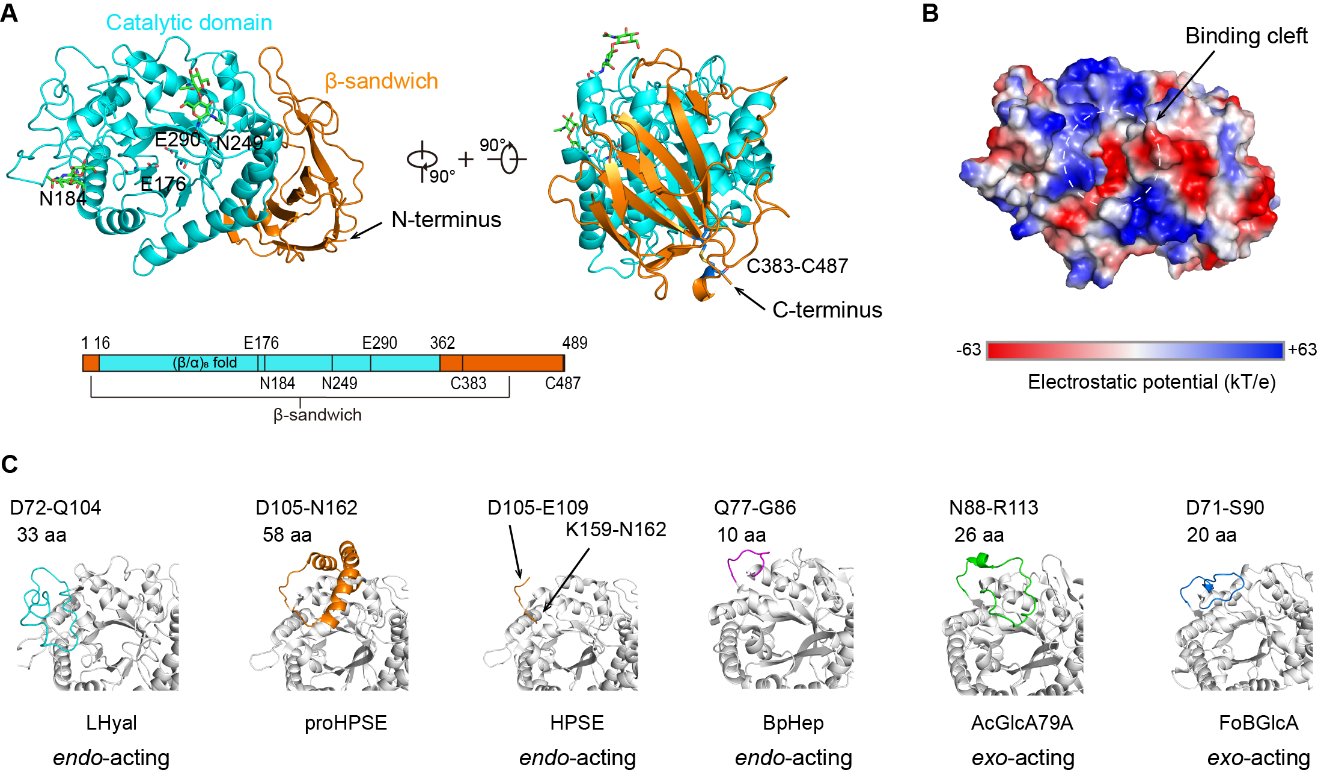 图1 LHyal的晶体结构以及GH79家族蛋白的‘exo-pocket’ loop比较
