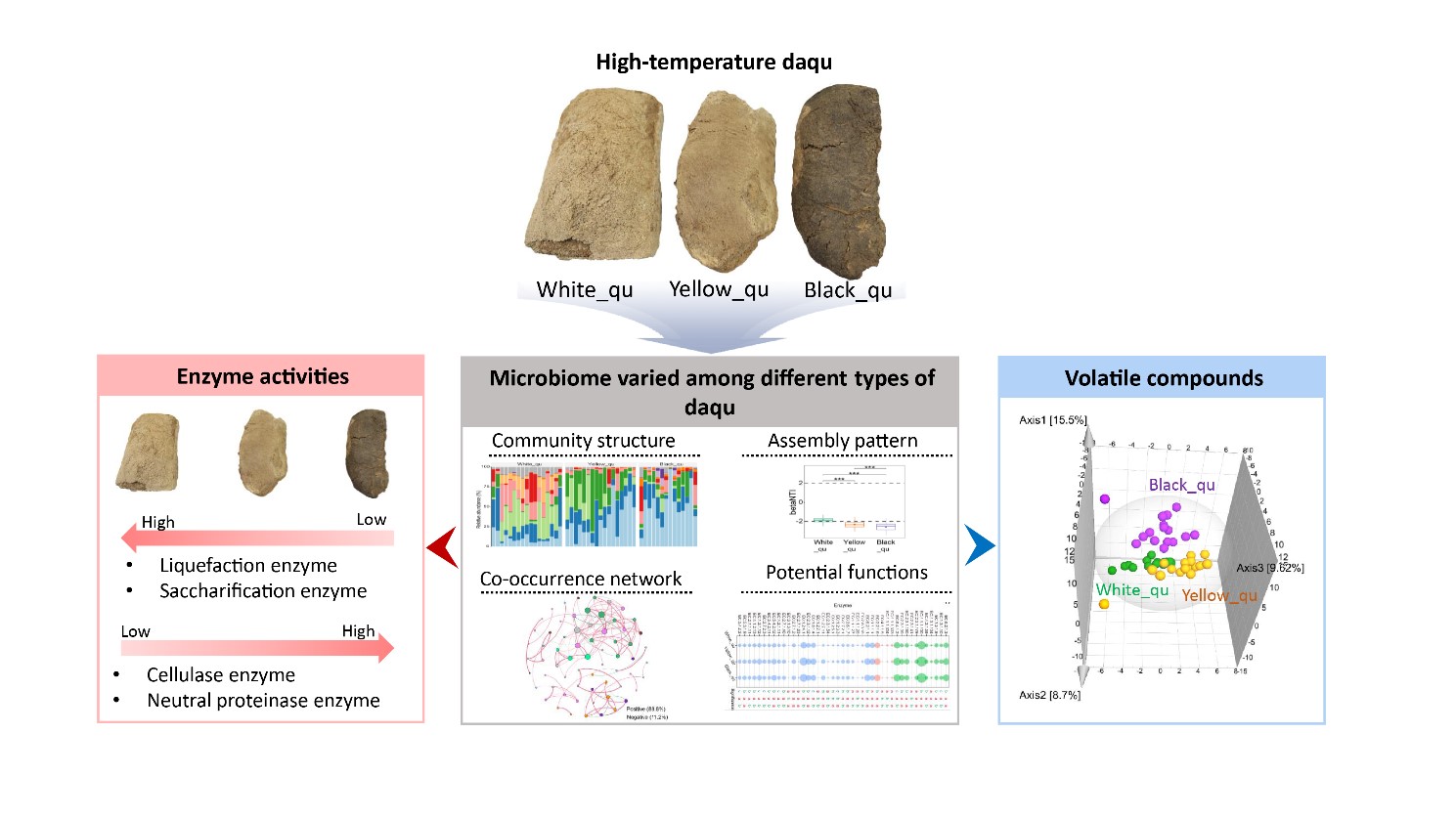许正宏教授团队联合泸州老窖沈才洪教授级高工团队,系统分析了白曲、黄曲和黑曲的酶学性质、挥发性物质和菌群结构及其功能。研究表明,发酵温度是影响大曲微生物群落形成与功能,造成大曲品质差异的关键因素。白曲具有较高的液化力和糖化力,黑曲的中性蛋白酶和纤维素酶酶活力较高,而黄曲的多种酶活力适中,是酱酒生产中用量最多的大曲,通常占总量的80%以上。非靶代谢组分析表明三种类型大曲的挥发性物质组成差异显著,黄曲和黑曲中挥发性物质总量及吡嗪类物质的相对含量高于白曲,提示了它们在酿造中对酱酒风味的重要贡献。高通量测序分析表明三类大曲的微生物群落结构差异显著,且细菌和真菌群落分别受确定性和随机性装配过程的控制,共现网络分析显示细菌类群之间的相互作用可能更强,这表明高温大曲中细菌群落可能比真菌更易受非生物环境因素和物种相互作用的影响。研究结果揭示了发酵温度对高温大曲的影响,三类大曲对酱香型白酒产量和风味品质的影响有待进一步研究。