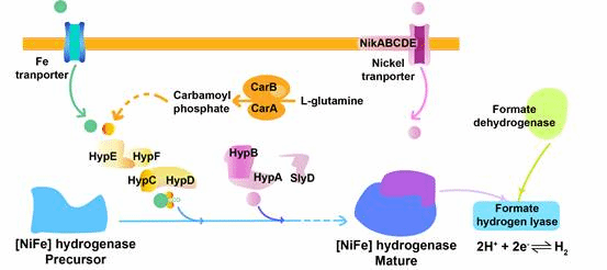 张娟教授团队针对目前平衡细胞耐受性和生产能力的问题,借助组学研究和系统生物学工具,研究了耐酸性表型的触发机制,即获得提高D-乳酸耐受性同时不影响细胞正常代谢的有效元素。耐酸适应性进化菌株的转录组检测表明,在[NiFe]氢化酶成熟过程中,过表达编码附属蛋白的基因HypB和HypC可以大大提高大肠杆菌在D-乳酸致死胁迫下的生存能力。[NiFe]氢化酶附属蛋白HypB和HypC是一类可以协助氢化酶催化质子还原生成氢的耐酸因子。在D-乳酸致死胁迫下,加强HypB和HypC的表达可使细胞存活率提高336.3倍。此外,HypB和HypC可以帮助D-乳酸生产菌在酸性发酵环境中表现出更高的可持续生产力,D-乳酸滴度将提高113.6%。为了进一步完善氢化酶附属蛋白的表达体系,本研究引入强酸驱动型启动子tdcAp,在保持D-乳酸最大强度生产的同时,可将发酵过程中的中和剂需求降低约26.7%。最终,该工程菌在低pH条件下显著提高了D-乳酸的生产能力和葡萄糖的利用率,并减少了中和剂的使用。这是首次报道氢化酶附属蛋白能够增强大肠杆菌对D -乳酸的耐酸性的研究,基于氢化酶系统的共性,该研究可为提高菌株在有机酸生产中的耐酸性提供参考。