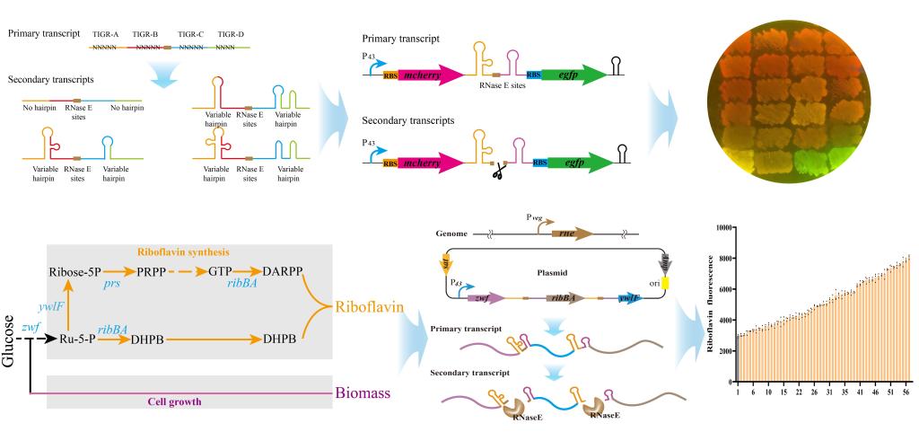 饶志明团队开发了协调操纵子中多基因表达的TIGR(基因间可协调文库)系统,该系统基于基因间mRNA工程调节mRNA的稳定性和二级结构来调节基因表达。在核黄素合成过程中,核酮糖-5磷酸是核黄素合成途径和嘌呤途径的共同前体,因此合理分配核酮糖-5磷酸的代谢流对提高核黄素前体供应至关重要。因此,本研究利用TIGR系统协调核黄素合成关键基因的表达水平,进而提高核黄素的产量。首先,构建含有TIGR的双报告基因操纵子文库,并确定TIGR对两个报告基因表达的调控作用,TIGR序列可协调双报告基因在枯草芽孢杆菌中的表达比例范围在70倍以上。接下来,使用TIGR文库调节核黄素合成关键基因zwf、ribBA和ywlf的表达,以增加核黄素生物合成的细胞内前体供应。根据核黄素具有荧光的特性,高通量筛选最佳组合突变组合。筛选得到的最佳工程菌株在摇瓶发酵过程中,核黄素产量达到2.7 g/L,提高64.35%;在5 L分批补料发酵中,核黄素产量达到11.77 g/L,提高了59.27%。由此表明,TIGR系统用于协调操纵子内关键基因表达可有效提高目标产物的产量。