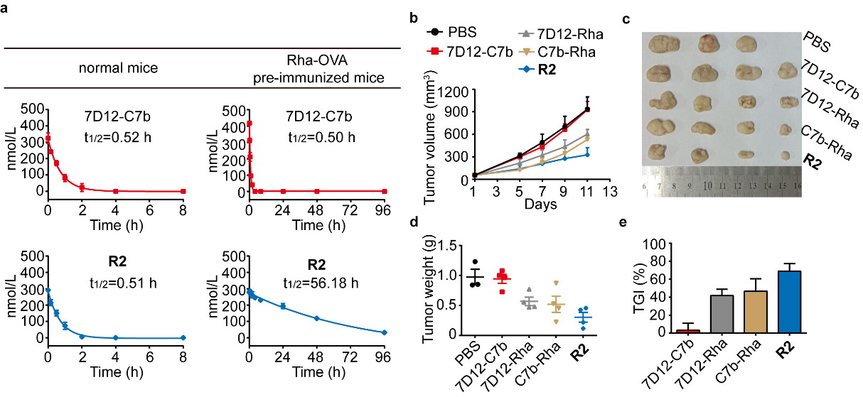 吴志猛教授研究团队在前期研究基础上,提出一种新策略--设计和合成了一种鼠李糖(Rha)修饰的双特异性纳米抗体(bsNb),提出将人体血清中存在的天然抗Rha抗体募集至肿瘤细胞表面,或与抗Rha抗体形成免疫复合物,分别达到激活Fc介导的免疫杀伤和延长半衰期的目的(图1)。团队设计和合成了不同长度PEG连接臂的bsNb-Rha偶联物,通过体外活性评价,发现PEG2的偶联物R2表现出最强的免疫治疗效果,且其效果也由于相应的单特异性纳米抗体(msNb)-Rha偶联物7D12-Rha和C7b-Rha(图2)。此外,该团队在小鼠体内证实R2具备显著的半衰期延长效应;在荷瘤小鼠中则发现,R2的肿瘤抑制率明显未Rha修饰的bsNb 7D12-C7b、以及两种msNb-Rha偶联物(图3)。该工作为开发新型基于抗体片段的bsAb药物提供了新思路。
