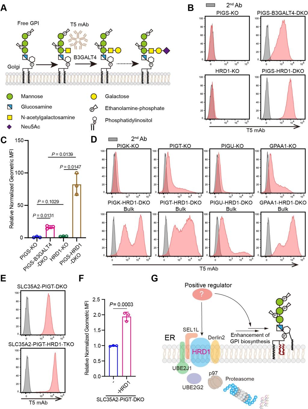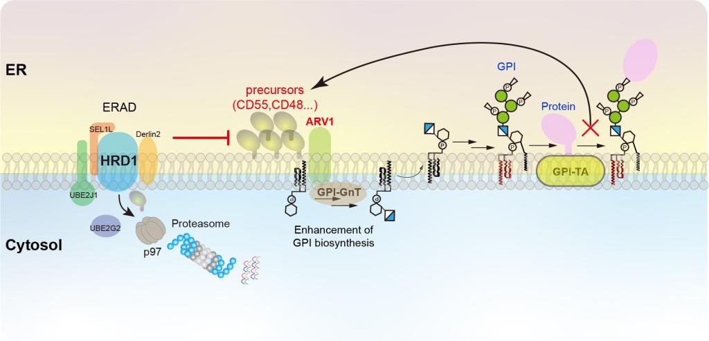 糖基磷脂酰肌醇(GPI)锚定化修饰作为真核细胞蛋白质糖基化修饰的重要方式之一,在细胞分化和生长、发育、信号传导、免疫以及受精过程中发挥重要作用。人体细胞中超过150种蛋白质被GPI修饰,包括酶、补体、配体和免疫调节因子等。大量研究发现,GPI锚定蛋白的异常表达与癌症和神经退行性疾病相关。因此,深入探究GPI锚定蛋白生物合成调控机制具有重要的生理学意义。GPI锚定蛋白的生物合成起始于内质网,经由高尔基体,最终表达到细胞膜表面。前期研究中,团队发现GPI的合成受到了内质网相关降解途径(ERAD)的调节。在ERAD途径缺陷的细胞中,GPI的合成上调,推测存在调控GPI合成的蛋白因子(图1)。