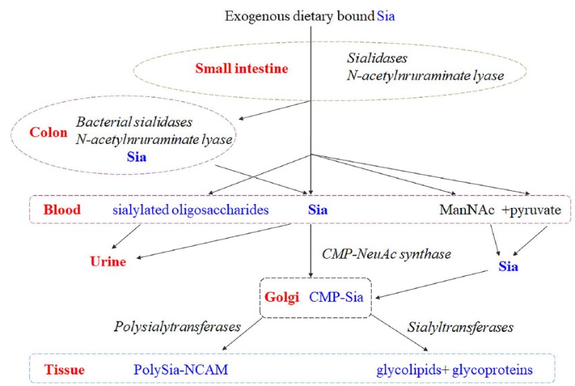 图2哺乳动物体内外源性唾液酸的代谢路径