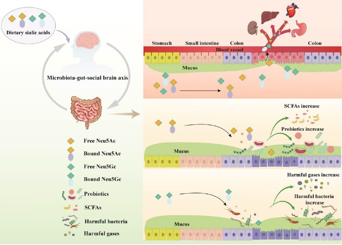 近年来,膳食唾液酸因其对人体健康的诸多有益影响而备受关注。唾液酸是一种吡喃糖结构的酮酸,包含九个碳并带有负电荷,广泛存在于细胞膜糖蛋白、糖脂,甚至生物体的RNA中。它在细胞与细胞和细胞与微环境的相互作用中起着至关重要的作用。自然界中的唾液酸很少以游离形式出现,而是以复杂的形式存在于几乎所有脊椎动物组织、细胞和体液中。其中,在中枢神经系统的神经节苷脂和糖蛋白中发现的唾液酸含量最高。然而,唾液酸,特别是结合形式的唾液酸,也存在我们一些日常的日常饮食中,例如食用燕窝、红肉、母乳、牛奶和蛋类。膳食中摄入的唾液酸聚糖和唾液酸糖蛋白会调节免疫系统、抑制病原体和病毒、促进大脑发育等。同时,唾液酸在人体肠胃道中表现出益生元的特性,通过阻碍病原菌增殖、促进共生菌生长和产生短链脂肪酸等代谢物来调节肠道微生物群,促进肠道健康。脑-肠轴通过调节肠道微生物群及其产生的代谢物充当调节人类健康和发病机制的管道。