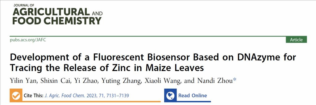 周楠迪教授团队在荧光生物传感器方面取得重要进展,研究成果“Development of a fluorescent biosensor based on DNAzyme for tracing the release of zinc in maize leaves”正式发表于Journal of Agricultural and Food Chemistry (IF = 5.895) (//pubs.acs.org/doi/10.1021/acs.jafc.3c00508)。