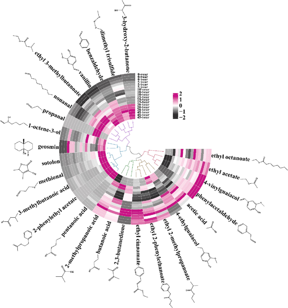 图2陈酿0年、5年、10年、15年、20年、45年的清香型白酒中香气物质浓度及其与陈年时间的相关性