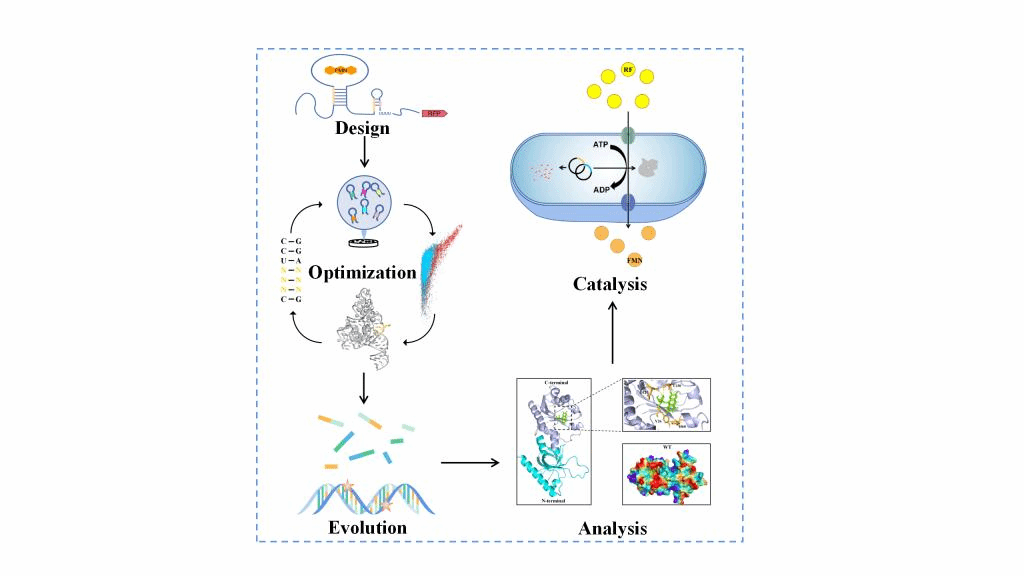 该研究首先对来源于Bacillus subtilis168的FMN核糖开关进行设计,基于核黄素操纵子5′-UTR能够受到FMN浓度变化影响从而改变自身构象的特性,构建了FMN生物传感器,并结合荧光蛋白对该传感器的功能进行了验证,结果发现野生型核糖开关响应FMN浓度范围区间较窄。因此,对核糖开关适配体与FMN非共价结合的位点进行研究,在J6/1位点进行突变,构建了饱和突变文库,并利用流式细胞仪进行高通量筛选,发现G5突变株荧光范围相较于野生型提高了127%,并基于此构建FMN生物传感器。接着,结合碱基编辑器TRACE系统,对来源于B. subtilis168的ribC基因进行体内持续进化,利用流式细胞进行高通量分选,初步筛选出1000株潜在的突变株,使用96孔板复筛,最终筛选出5株可能的有益突变株。酶活测定发现,相较于野生型,这5株突变株的酶活均有明显的提高。最终,在摇瓶中对突变株进行了全细胞催化实验,发现FMN的最高产量达到43.7 mg·L-1,摩尔转化率达到18.3%,产量提高至野生型的7.86倍,该研究构建的高通量筛选平台能够在大量、生理多样性的突变文库中筛选出正突变表型,为快速筛选工业化菌株提供了一个新途径。