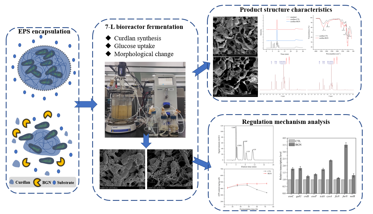 在该研究中,研究人员提出了一种简单而新颖的方法,通过定量补加内切β-(1,3)-葡聚糖酶(BGN),实时降解发酵体系多糖,解除多糖包裹效应,缓解溶氧供给限制,在生产更高附加值产品的同时,发酵性能也明显提升。在摇瓶培养基中定量补加2%-10%(v·v-1)的BGN获得了在18.99×104 Da-3.20×104 Da之间低重均分子量的热凝胶,相比之下,未补加BGN的对照组热凝胶分子量为21.33×104 Da。场发射扫描电镜图显示补加4% BGN明显降解了多糖对菌体的包裹,在7-L发酵罐中,发酵108小时后,葡萄糖消耗量和热凝胶产量与对照相比分别提高了43%和67%达到66.41 g/L和34.53 g/L。胞内核苷酸代谢以及转录水平的变化显示,补加BGN对多糖包裹的降解增强了土壤杆菌的呼吸代谢强度、能量再生效率以及热凝胶合成相关酶的活性。本研究提出的策略可应用于生产其他微生物胞外多糖。