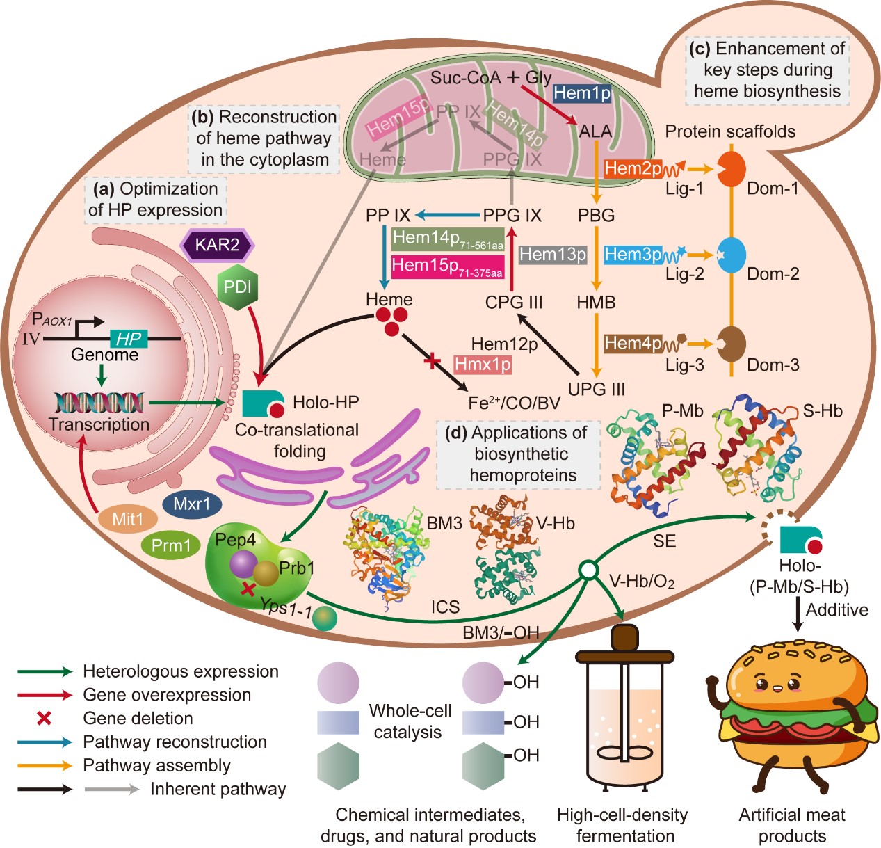 血红素结合蛋白是一大类以血红素为辅基的具有重要生理功能的蛋白或酶,包括血红蛋白(Hb)、肌红蛋白(Mb)、细胞色素P450酶、过氧化氢酶和过氧化物酶等。目前,这些血红素结合蛋白/酶已经应用于食品、医药、高细胞密度发酵以及生物催化剂等多个领域。其中,猪肌红蛋白(P-Mb)与肉的颜色以及风味密切相关;大豆血红蛋白(S-Hb)已作为颜色添加剂用于人造肉的生产;透明颤菌血红蛋白(V-Hb)具有很强的氧运输能力,常用于代谢工程领域以促进细胞生长和产物合成; P450-BM3单加氧酶可以实现区域选择性和立体选择性羟基化催化,常用作药物、天然产物和化学中间体合成的全细胞生物催化剂。