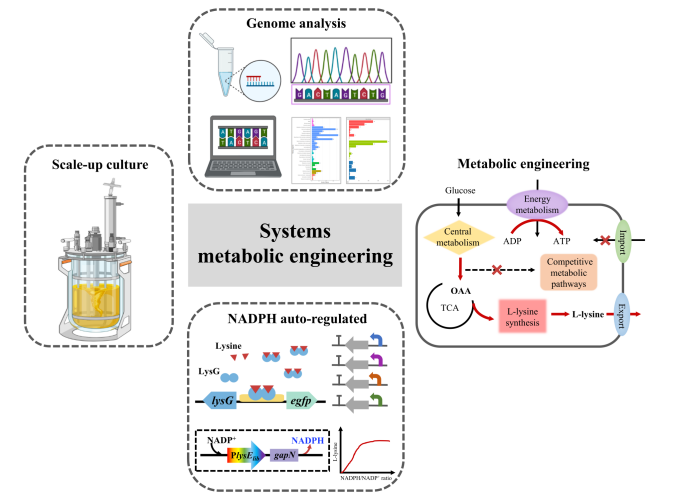 张伟国教授团队在L-赖氨酸的高效制备方面取得重要进展,研究成果“L-lysine production by systems metabolic engineering of an NADPH auto-regulated Corynebacterium glutamicum”正式发表于Bioresource Technology (IF = 11.4) (//doi:10.1016/j.biortech.2023.129701)。由于L-赖氨酸在食品加工、药物制造和饲料添加剂中的商业重要性,人们已经努力开发能够有效生产L-赖氨酸的微生物细胞工厂。然而,代谢途径的高度复杂性和相互关联性导致单个基因的过度表达或敲除,通常导致意想不到的表型。近年来,系统代谢工程使微生物细胞工厂能够同时修改多个控制基因的设计,以高效生产各种代谢产物,已成为打破障碍的有力武器。