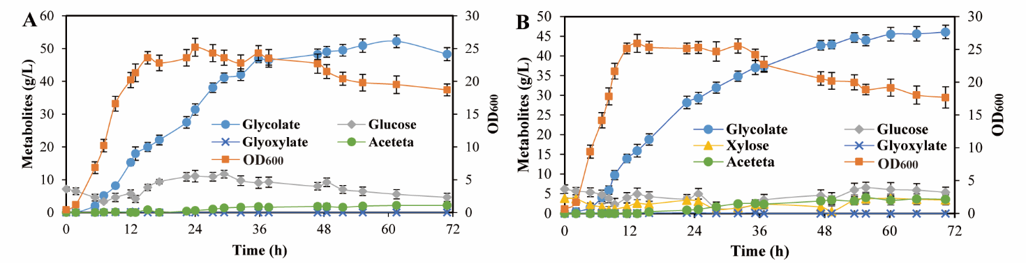 菌株Mgly10-245在5L发酵罐中以葡萄糖为底物进行分批补料发酵,结果表明,菌株Mgly10-245在61.5 h乙醇酸产量最高,达到了52.2 g/L (理论产量的90.5%),这是是迄今为止不添加诱导剂的最高产量。随后,菌株Mgly10-245在5L发酵罐中以玉米秸秆水解液为底物进行分批补料发酵,结果表明,菌株Mgly10-245在70.3 h时乙醇酸产量最高,达到了46.1 g/L (为理论产量的77.1%)。