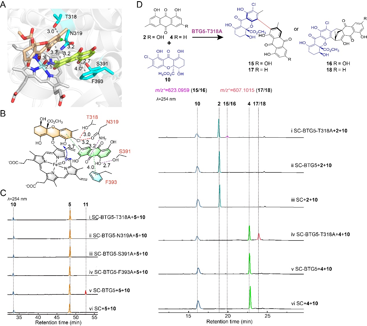 受限于P450的表达,为进一步研究BTG5,作者利用AlphaFold2模拟其结构模型,并将血红素和底物对接到BTG5的模型中,结果表明底物口袋中残基T318、N319、S391和F393对于BTG5的底物结合和催化反应至关重要,接下来,尝试通过丙氨酸扫描进一步探索BTG5对含双环[3.2.2]壬烷化合物多样性的催化活性,LC-MS结果表明BTG5-T318A突变位点表现出催化大黄素和大黄酚与卤代氧杂蒽酮发生二聚的反应(图2)。