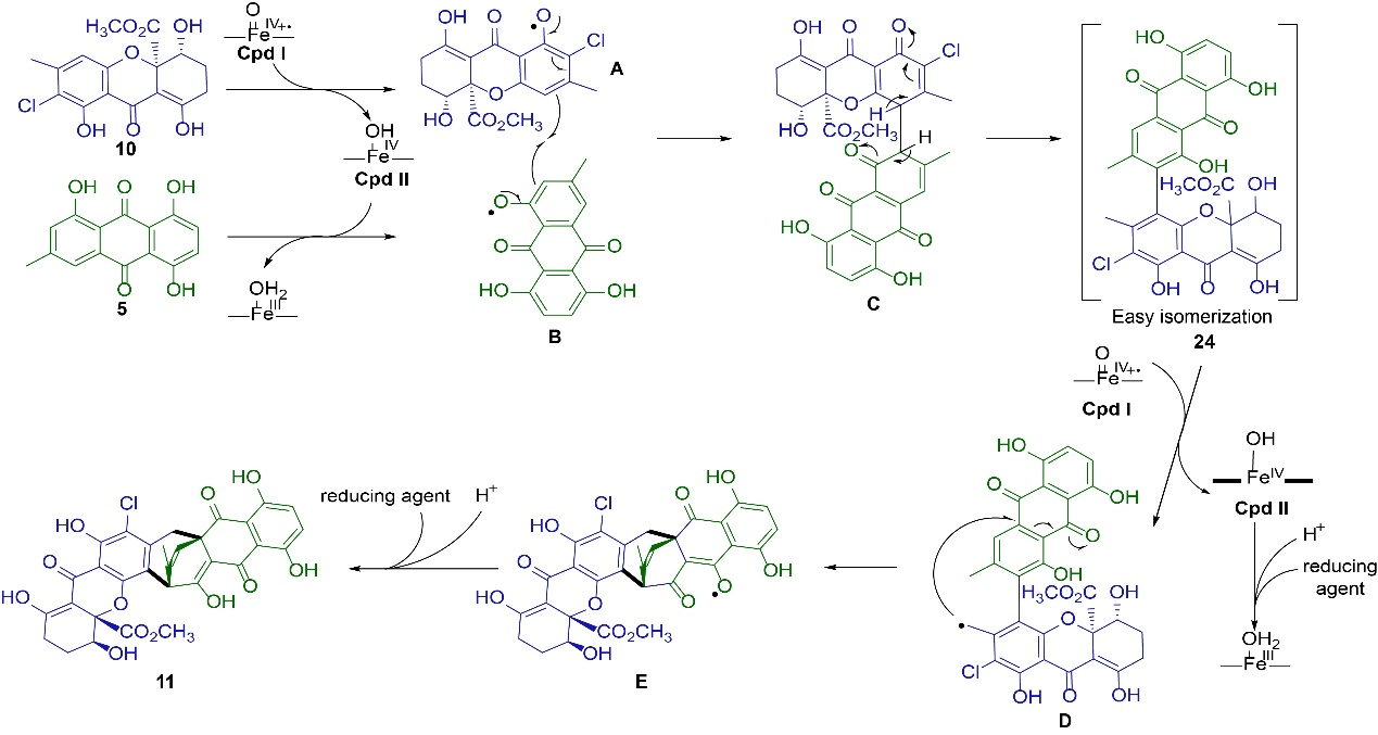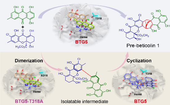 具有双环[3.2.2]壬烷结构的天然产物具有良好的生物活性和应用前景。前期本课题组研究发现beiticolin 1由一个蒽醌和一个卤代氧杂蒽酮通过双环[3.2.2]壬烷骨架连接而成 (Hou, et al, Angew, 2022, Hou, et al, Nature Commun, 2023),但是关键酶及其催化机理尚不清楚。本研究发现真菌P450 BTG5在beticolin 1生物合成中负责构建独特的双环[3.2.2]壬烷骨架,且该过程包含特殊的二聚化和环化两个步骤。经过蛋白工程改造,发现突变体BTG5-T318A可以实现该两步催化机理的拆分,使催化反应停留在二聚体反应,并可接受系列天然和非天然蒽醌底物与卤代氧杂蒽酮形成二聚体。更重要的是,本研究揭示了BTG5催化的第二步环化反应是罕见P450催化形式氧化还原中性的环化反应,实际包含了氧化和还原两步的过程。以上研究结果更新了P450催化反应的认识范畴,为合成生物学策略创制该类天然产物的复杂性和多样性提供了基础。
