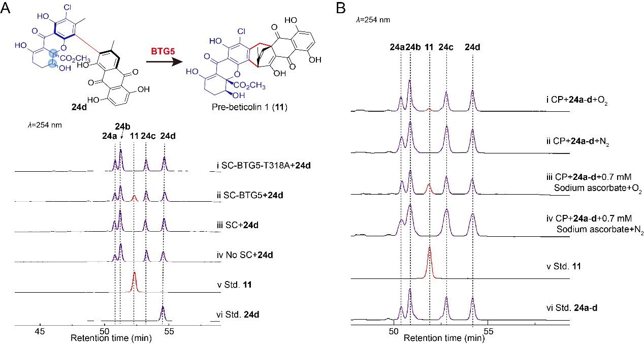 由于从ΔCTB1/BTG5-T318A菌株中分离到卤代氧杂蒽酮和长蠕孢素的二聚体化合物24a-d,为了进一步研究BTG5的催化机制,纯化的二聚体化合物24d被加入到表达BTG5的酵母中,结果显示产生了pre-beticolin 1(图4A)。这表明,BTG5在双环[3.2.2]壬烷骨架构建中的催化机制涉及一种罕见的两步机制,即二聚化和环化。尽管在其他研究中也有P450催化两步反应的报道,但BTG5的第二环化过程是独特的,它是一个形式上氧化还原-中性的反应,而不是P450常见的氧化过程。为了进一步研究环化机制,使用敲除两个聚酮合酶(ΔCTB1/ΔBTG4)的菌株进行了更深入的研究。结果显示环化反应对氧气的依赖性。由于这种形式上氧化还原-中性反应需要氧气,因此还研究了还原剂对环化反应的影响。加入抗坏血酸钠后,反应效率明显提高,证明还原剂在BTG5催化的环化反应中的重要性(图4B)。作者还排除非氧化还原碱介导的Michael加成反应的可能性。综上所述,这表明BTG5催化构建双环[3.2.2]壬烷结构的第二步形式上氧化还原-中性的环化反应涉及一个氧化还原介导的过程,而这一过程从未被报道过。