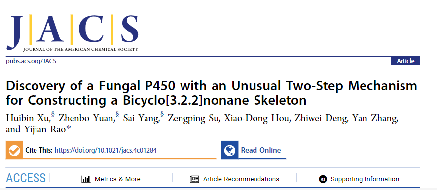 饶义剑教授团队在真菌P450构筑特殊药物基团双环[3.2.2]壬烷骨架的罕见两步催化机制研究方面取得重要进展,研究成果“Discovery of a fungal P450 with an unusual two-step mechanism for constructing bicyclo[3.2.2]nonane skeleton”在线发表于化学顶刊J Am Chem Soc (IF = 15.0) (//doi.org/10.1021/jacs.4c01284)。