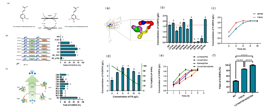 5-羟基阿魏酸(5-OHFA)是阿魏酸(FA)的邻羟基化衍生物,具有更强的抗氧化能力和水溶性,在医药、食品添加剂、化妆品等行业具有巨大的应用潜力。5-羟基阿魏酸通常是由邻位羟化酶在阿魏酸的C5位插入一个羟基生成的。4-羟基苯基乙酸3-羟化酶(4HPA3Hs)是一类细菌中双组份黄素依赖性单加氧酶,包括加氧酶组分(HpaB, EC 1.14.14.9)和还原酶组分(HpaC, EC 1.5.1.36),能实现多种酚类化合物的邻位羟基化。