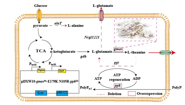 L-茶氨酸是一种应用广泛的天然非蛋白氨基酸,广泛用作食品添加剂和精神类药物原料。目前主要采用生物发酵法生产L-茶氨酸,该方法需要效率高和稳定性好的功能酶作为支撑。因此,需要筛选和改造适合L-茶氨酸生产的酶来实现发酵高效生产L-茶氨酸。