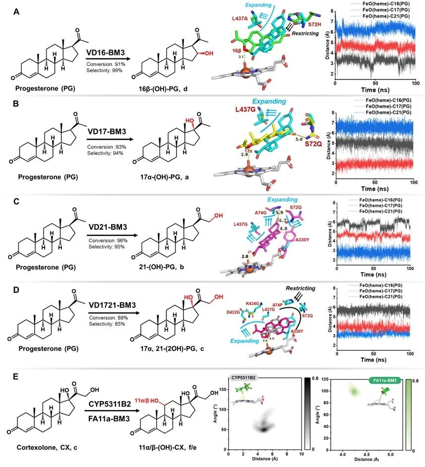食品合成生物学与生物制造团队研究人员基于计算模拟指导改造了P450BM3并用于黄体酮合成皮质酮再合成氢化可的松的两步合成途径中。第一步合成:以野生型P450BM3(Bacillus megaterium来源)出发,逐步通过B-Factor指导的底物通道改造、重塑heme中心口袋和自由能计算指导的heme中心口袋柔性化的三代精细化酶工程,最终获得了VD16-BM3、VD17-BM3、VD21-BM3和VD1721-BM3可以分别高效区域选择性羟化黄体酮的C16β、C17α、C21和C17α/21,值得注意的是VD1721-BM3可以将黄体酮合成皮质酮的步骤简化为一步单酶反应。第二步合成:需要获得高效催化元件羟基化修饰皮质酮的C-11位,首先分别验证了文献报道的CYP5311B2和LG23,其中CYP5311B2可以羟化修饰皮质酮的C-11β,其转化率和区域选择性分别为93%和91%,可以用于后续氢化可的松全细胞合成体系构建。CYP5311B2和LG23催化进程研究发现底物通道是影响P450羟化修饰甾体不同碳位的关键,因此基于底物通道切换策略,理性改造得到了FA11a-BM3可高效催化皮质酮合成11α-氢化可的松,转化率和区域选择性分别为85%和90%。分子动力学模拟揭示了heme中心口袋排斥底物残基的柔性化有助于目标羟化碳位稳定暴露于FE=O上方。最终,将开发的P450突变体用于构建高效的大肠杆菌全细胞催化体系,实现了从1 g/L黄体酮一锅生产11α/β-氢化可的松,摩尔转化率为81%和84%。本研究为简化甾体药物的生物合成步骤和生物催化剂提供了可行的策略。