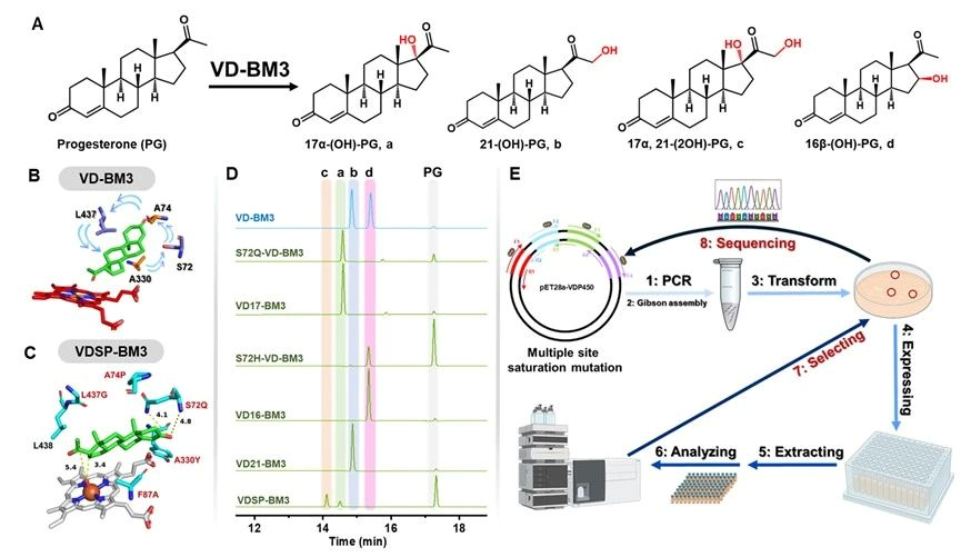 皮质类固醇(Corticosteroids)是由肾上腺皮质产生的类固醇,氢化可的松(Hydrocortisone)和皮质酮(Cortexolone)等皮质类固醇物质因具有丰富的羟基化修饰使其成为治疗过敏、皮炎和肾上腺功能障碍等疾病的理想选择。黄体酮(Progesterone)是皮质类固醇的主要碳骨架,其可以经葡萄糖作为底物在微生物宿主从头合成得到,因此被认为是合成氢化可的松等皮质类固醇的“绿色”底物。传统的黄体酮合成氢化可的松生物途径为三步反应,至少需要6种酶共表达,多酶表达和复杂的酶级联反应限制了氢化可的松的高效合成。此外,黄体酮中因存在丰富的惰性C-H键,在不产生过多副产物的情况下利用P450实现对其骨架的精准单一或多重羟基化修饰在合成生物学中同样是一项艰巨的任务之一。因此,需要设计新的P450催化元件,丰富类固醇的区域选择性羟基化位点,简化黄体酮合成氢化可的松的合成步骤,进而实现皮质类固醇高效生物合成。
