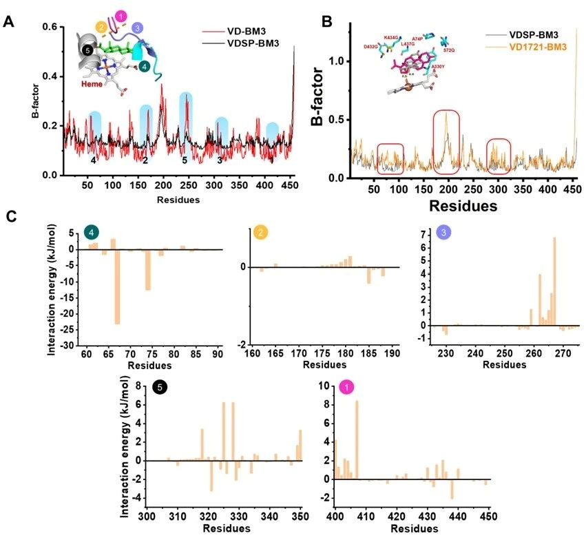 图5 分子动力学模拟揭示P450BM3突变体高效区域选择性羟化修饰机制