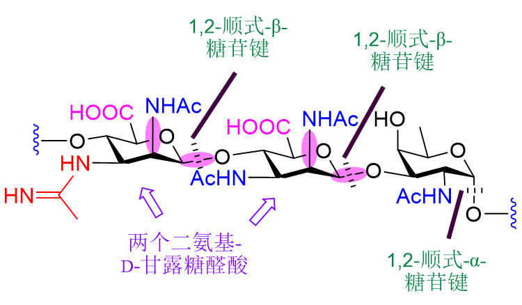 绿脓杆菌是引起医院感染的主要病原体之一,导致的死亡率约为5.3%。随着绿脓杆菌抗生素耐药性的不断提高,开发安全、高效的绿脓杆菌疫苗已成为国家保障人民生命健康的重要需求。研究表明,人体免疫系统可对绿脓杆菌脂多糖O-抗原产生保护性免疫,因此O-抗原作为免疫靶点已广泛用于绿脓杆菌疫苗的开发。绿脓杆菌O5血清型O-抗原由三糖重复单元[→4)-β-D-ManpNAc3NAmA-(1→4)-β-D-ManpNAc3NAcA-(1→3)-α-D-FucpNAc-(1→]组成(图1),其中非还原端2,3-氨基-D-甘露糖醛酸C3位修饰有碱性乙脒基。该三糖全部由稀有单糖组成,其中两种连续的β-D-ManpN3NA二糖自然界中罕见,所有糖苷键连接均为1,2-顺式-糖苷键,包括两个β-D-甘露糖苷键和一个α-D-岩藻糖苷键,另外三糖上糖环的高度功能化修饰,进一步增加了其化学合成的挑战性。发展绿脓杆菌O5血清型O-抗原寡糖的化学合成方法,并将合成寡糖应用于生物医药研究,将为明确这一结构特异性糖链的免疫活性构效关系提供基础。