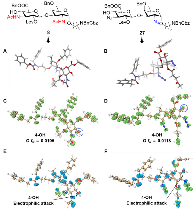在糖基受体中增加供电子性保护基和减少吸电子性保护基可以提高糖基受体反应活性已被熟知,但是其理论机制并未充分阐明。尹健教授团队基于具有不同反应活性的2种二糖受体8和27,利用量子化学计算探究了糖基受体活性调控的理论机制(图2)。首先,计算得到了糖基受体的优势构象,发现不同活性的糖基受体优势构象无显著差异。鉴于糖基受体的羟基需亲核进攻糖基供体,通过轨道权重福井函数和双描述符对不同糖基受体羟基的亲核性进行定量分析,可直观的呈现出高活性糖基受体是亲核性占主导,而低活性受体则有较高比例的亲电性。为了进一步定量比较不同分子羟基的亲核性,引入软度参数与福井函数(fw-)结合,从而更准确地定量分析不同分子间亲核性的差异。