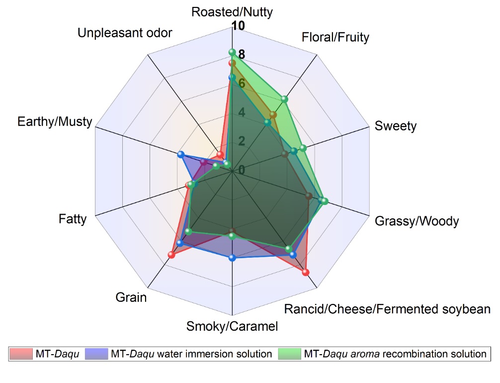 研究团队采集了全国不同浓香型白酒产区的42个中温大曲样品,设计了“自上而下”和“自下而上”相结合的研究策略,采用挥发组学和感官评价等方法,确定了52种曲香香韵描述词,鉴定了37种曲香活性化合物,构建了包含曲香风味描述和曲香活性化合物信息的中温大曲曲香香气轮。在此基础上,重构了中温大曲曲香并鉴定了其中26种关键曲香活性化合物。相关研究成果为大曲品质的科学评估和质量标准的建立奠定了研究基础,为白酒行业“新质生产力”的发展提供了重要保障。