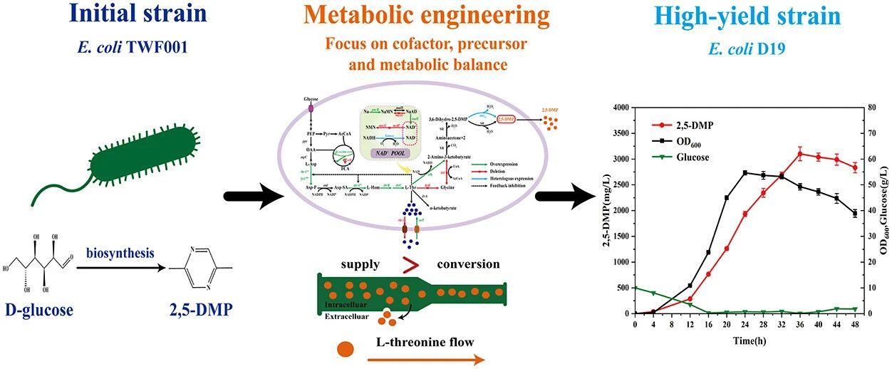 2,5-二甲基吡嗪(2,5-DMP)是一种高附加值烷基吡嗪类化合物,在食品(作为香料,具有坚果香味)和医药领域(作为格列吡嗪,阿昔莫司等抗高血压或降血糖类药物的中间体)都具有重要的应用价值。相对于反应条件不温和、使用有毒有害试剂的化学合成过程来说,开发高效的微生物细胞工厂合成2,5-DMP是具有可持续性的发展方向。然而,目前已报道的2,5-DMP工程菌株存在产量低、需要添加昂贵试剂等问题。这里,我们通过代谢工程的策略构建了一株无需诱导剂,无需抗生素的高产2,5-DMP的大肠杆菌。首先,在出发菌株中重新构建了2,5-DMP的合成途径。随后通过改善辅因子和前体物L-苏氨酸的供应提高了2,5-DMP的产量。最后优化了关键基因tdh在染色体上的拷贝数,并修饰了L-苏氨酸的转运系统。最终的工程菌株产生了3.1 g/L的2,5-DMP,这是迄今为止已报道的以葡萄糖为碳源发酵生产2,5-DMP的最高产量。本研究使用的策略为2,5-DMP及其衍生物的工业生产奠定了基础。
