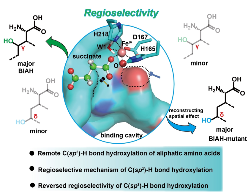 刘立明教授团队在脂肪族氨基酸远程C(sp3)-H键羟基化区域选择性调控方面取得重要进展,研究成果“Rational Design of the Spatial Effect in a Fe(II)/α-Ketoglutarate Dependent Dioxygenase Reverses the Regioselectivity of C(sp3)-H Bond Hydroxylation in Aliphatic Amino Acids”正式发表于Angewandte Chemie International Edition (IF = 16.1) (//doi.org/10.1002/anie.202406060)。