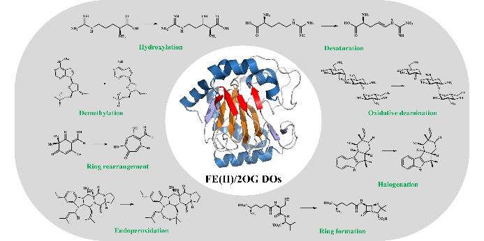 Fe(II)和2-酮戊二酸依赖型双加氧酶(Fe/2OG DOs)是一个超家族的酶,在羟基化、成环、环重构等多种催化反应中发挥重要作用。这个家族的每个成员在整体结构上都有相似之处,但执行不同功能的成员又有其结构独特性,这使得Fe/2OG DOs具备引人注目的催化多样性。随着目前研究的深入,发现了更多的Fe/2OG DOs,其催化范围进一步扩大;然而,除羟基化作用外,许多反应机制尚未得到准确证明,对其分子基础缺乏系统的认识。最近,越来越多的Fe/2OG DOs的X-ray结构为其功能和底物结合特性的结构基础提供了新的见解。这些结构信息对于理解催化机理和挖掘潜在的催化反应是必不可少的。对此,聂尧教授课题组基于天然产物合成中Fe/2OG DOs结构与催化功能之间的关系,综述了近年来发现的大部分Fe/2OG DOs的结构特征,并以反应类型分类探讨了各种结构元件与独特催化机理之间的关系。