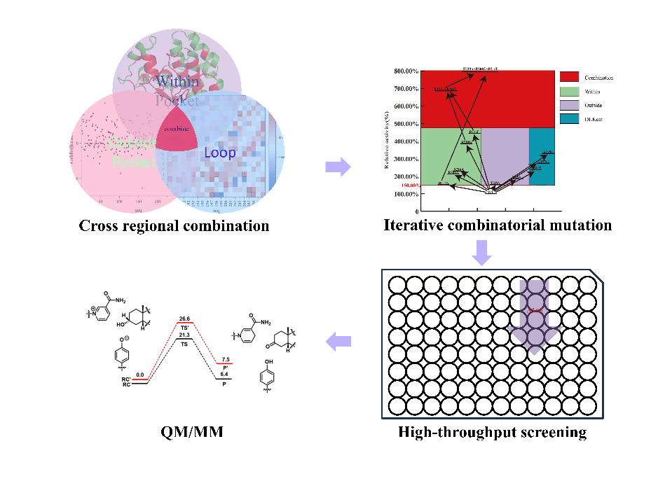 为了增强3α-HSD的酶活性,罗玮教授团队采用了半理性设计方法,对于活性位点口袋内的残基,通过比较它们与催化三联体的保守性水平,识别出相对非保守的氨基酸位置进行饱和诱变。对于活性位点口袋外的残基,在分子对接后进行了虚拟饱和诱变,并根据结合能计算选择突变进行实验验证。对于涉及底物结合的Loop区,利用深度学习工具预测kcat值进行预测分析,并通过湿实验进行了验证。通过饱和以及组合突变筛选突变位点,最终获得了一个高活性突变体,催化效率提升10倍,为降低3α-HSD在临床诊断中的应用成本奠定了坚实基础。同时,基于分子动力学模拟、QM/MM计算等策略,解析了3α-HSD酶活性提升的关键机制。