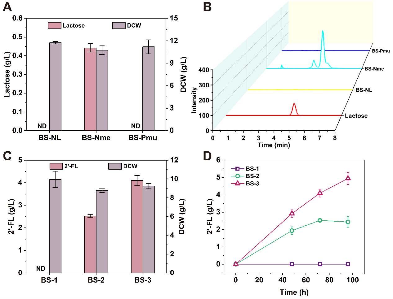图2 以葡萄糖为唯一碳源合成乳糖和2¢-FL