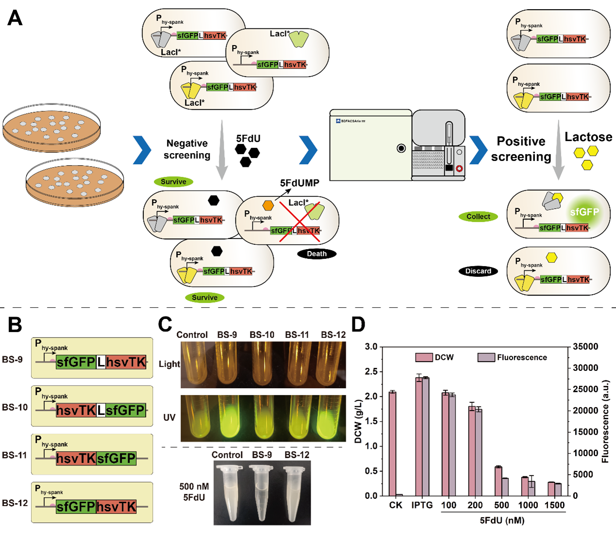 在此基础上,为实现乳糖合成模块与2¢-FL合成模块的动态调控,该研究结合致死基因回路和荧光信号基因回路的设计,搭建了一种高通量的乳糖响应型生物传感器筛选平台(图4),成功获取多种可以响应乳糖信号的生物传感器(图5);基于该乳糖生物传感器构建了乳糖响应遗传回路,用于动态调节乳糖和2¢-FL生物合成模块之间的代谢通量;最终,工程菌株在摇瓶中的2¢-FL产量提高至9.67 g/L,在3-L发酵罐中以葡萄糖为唯一碳源的产量和转化率分别达到30.1 g/L和0.15 g/g(图6)。相关研究成果为构建高效合成2¢-FL的细胞工厂提供了重要参考。