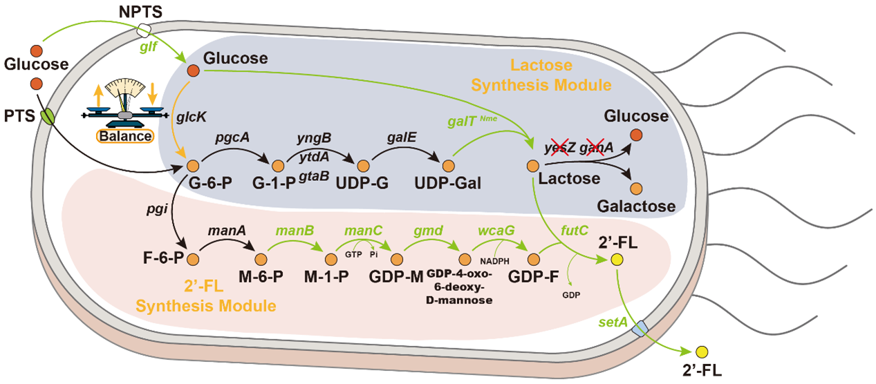 母乳寡糖(Human milk oligosaccharides,HMOs)是母乳中含量仅次于乳糖的碳水化合物,在促进新生儿肠道菌群稳态、肠道益生菌定植、新生儿免疫系统的发育和抑制感染等方面具有重要作用。2¢-FL是母乳中含量最多且研究最广泛的HMOs,已被全球多个国家或地区的相关机构批准作为食品营养强化剂使用。目前2¢-FL的制备方法主要是微生物发酵法。但是,发酵法合成2¢-FL过程中除了使用必要的碳源,还需要添加乳糖作为糖基转移受体,双碳源发酵过程增加了总体的生产成本和微生物的代谢负担。另外,由于缺乏合适的调控元件,在引入乳糖合成模块后无法有效地平衡乳糖合成模块与2¢-FL合成模块的前体竞争。为了消除2¢-FL合成过程对乳糖的依赖,研究人员已开发了利用其他碳源代替乳糖的生产方法。但是,依然没有以葡萄糖为唯一碳源进行2¢-FL的生物合成(图1)。