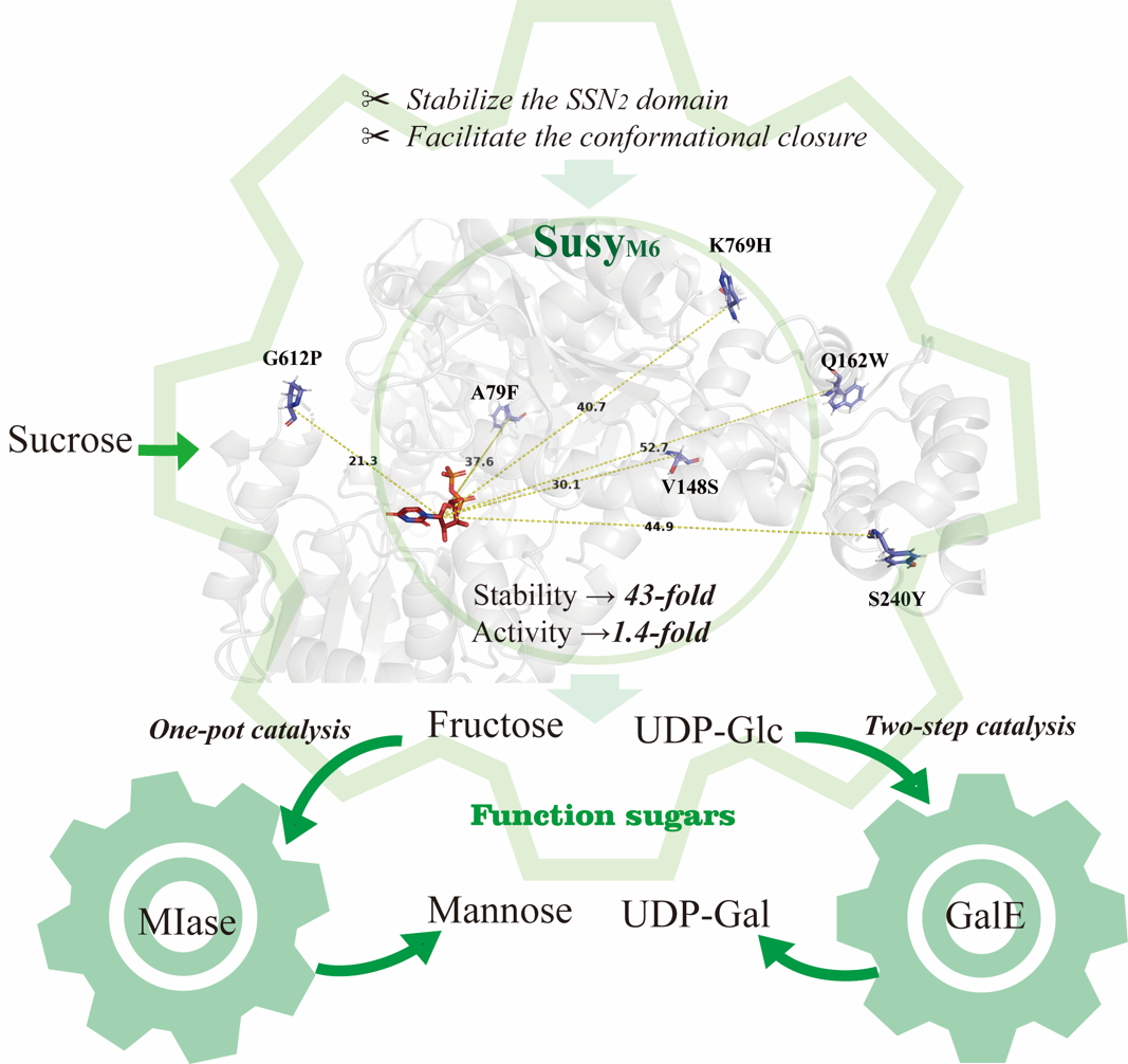蔗糖合酶可一步催化蔗糖断裂生成果糖与尿苷二磷酸葡萄糖(UDP-Glc)。UDP-Glc是葡萄糖的活化形式,在糖科学领域具有重要作用。它作为Leloir型糖基转移酶的常见糖供体底物,用于合成多种活性糖苷,如二氢查耳酮、人参皂苷、红景天苷等。UDP-Glc也可作为重要前体用于尿苷二磷酸半乳糖(UDP-Gal)和尿苷二磷酸葡萄糖醛酸(UDP-GlcA)等糖供体的合成,进而参与人乳寡糖、透明质酸等活性寡糖生产。此外,UDP-Glc其自身与人类健康密切相关,在防止癌症细胞远端转移及器官排异中具有重要作用。利用丰富廉价的蔗糖为底物制备UDP-Glc并将其进一步异构为UDP-Gal具有潜在的应用价值;同时将副产物果糖异构化为甘露糖,也有利于蔗糖的进一步高值化利用。但蔗糖合酶的稳定性与活性仍有待进一步提高,以解决UDP-Glc生产时间长,生产效率低的现状。