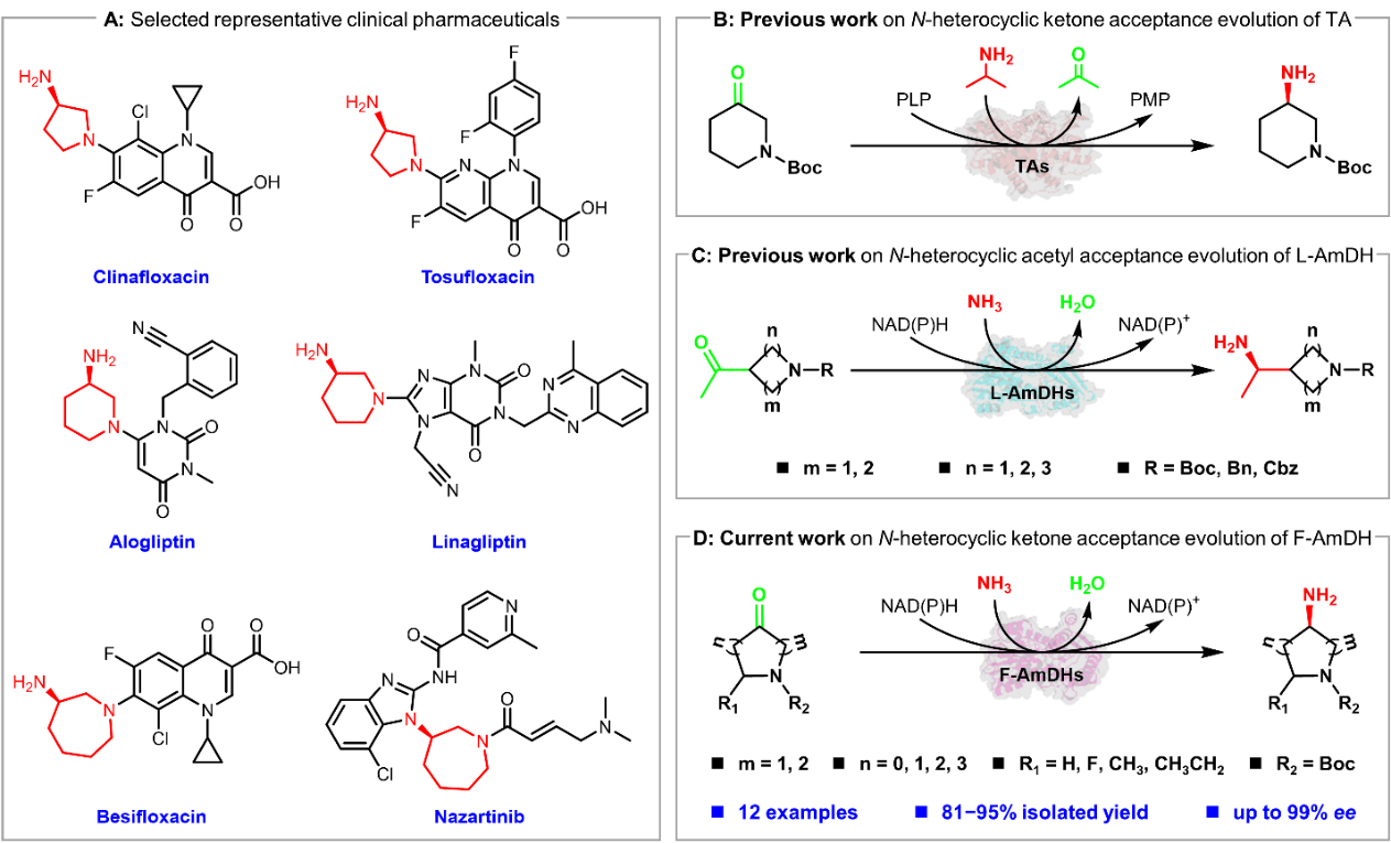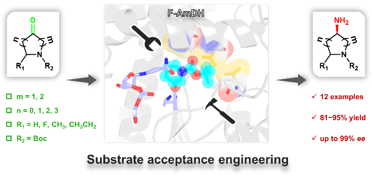 该研究首次报道了基于胺脱氢酶催化不对称生物合成制备此类手性氮杂环胺,为高附加值手性氮杂环胺药物构建砌块的生物催化绿色合成奠定了基础,并为胺脱氢酶家族成员及具有类似底物结合口袋的氧化还原酶的底物接受度的分子改造提供了可参考的工程指导。