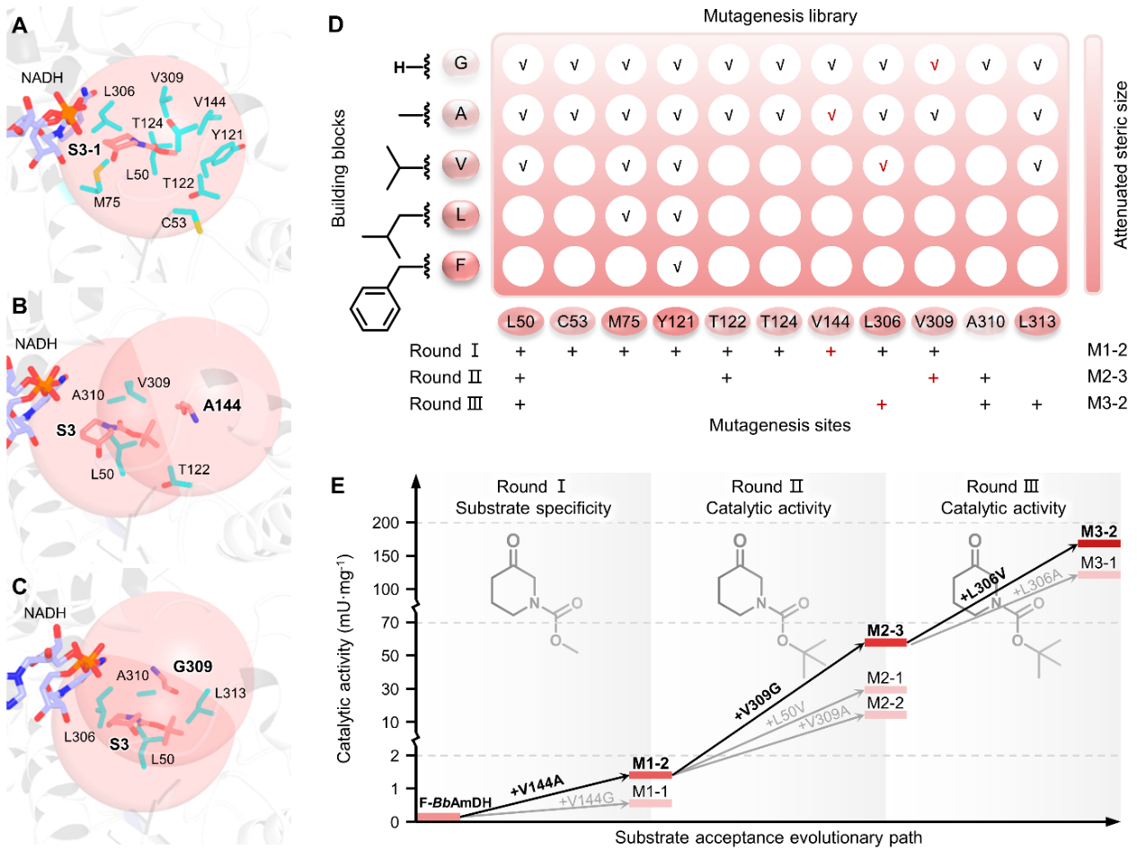 穆晓清/聂尧组ACS Catalysis|重塑亮氨酸脱氢酶底物结合口袋以双向催化结构多样性底物)、ACS Catalysis. 2024; 14: 2685-2695-封面论文、Chemical Engineering Journal. 2024; 490: 141735),选择N-Boc-3-哌啶酮作为本研究中胺脱氢酶催化的氮杂环酮模型底物,通过基于逆行底物设计策略的起始底物筛选,对模型底物进行结构拆解,选择小尺寸的N-Boc-3-乙酸甲酯作为底物接受度改造的起始底物,并以起始底物的催化活性为筛选指标,从实验室建立的小型胺脱氢酶文库中筛选出源于栗褐芽孢杆菌(Bacillus badius)的苯丙氨酸胺脱氢酶(F-BbAmDH)作为目标氮杂环酮底物接受度改造的出发酶。随后,进一步通过基于结构指导的底物结合口袋空间位阻突变对F-BbAmDH进行底物接受度进化,获得的单点突变体V144A成功产生了模型底物N-Boc-3-哌啶酮的底物特异性,额外的两轮迭代位点组合突变构建的三点突变体V144A/V309G/L306V对模型底物N-Boc-3-哌啶酮的催化活性较单点突变体V144A提高了143.4倍(图2)。