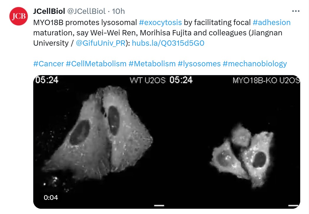 中西秀树教授团队在溶酶体分泌调控截短甘露糖型N-聚糖的细胞膜表达方面取得重要进展,研究成果“MYO18B promotes lysosomal exocytosis by facilitating focal adhesion maturation” 正式发表于Journal of cell biology(Q1,IF=7.4,//doi.org/10.1083/jcb.202407068),JCB官网对该成果进行了推介。
