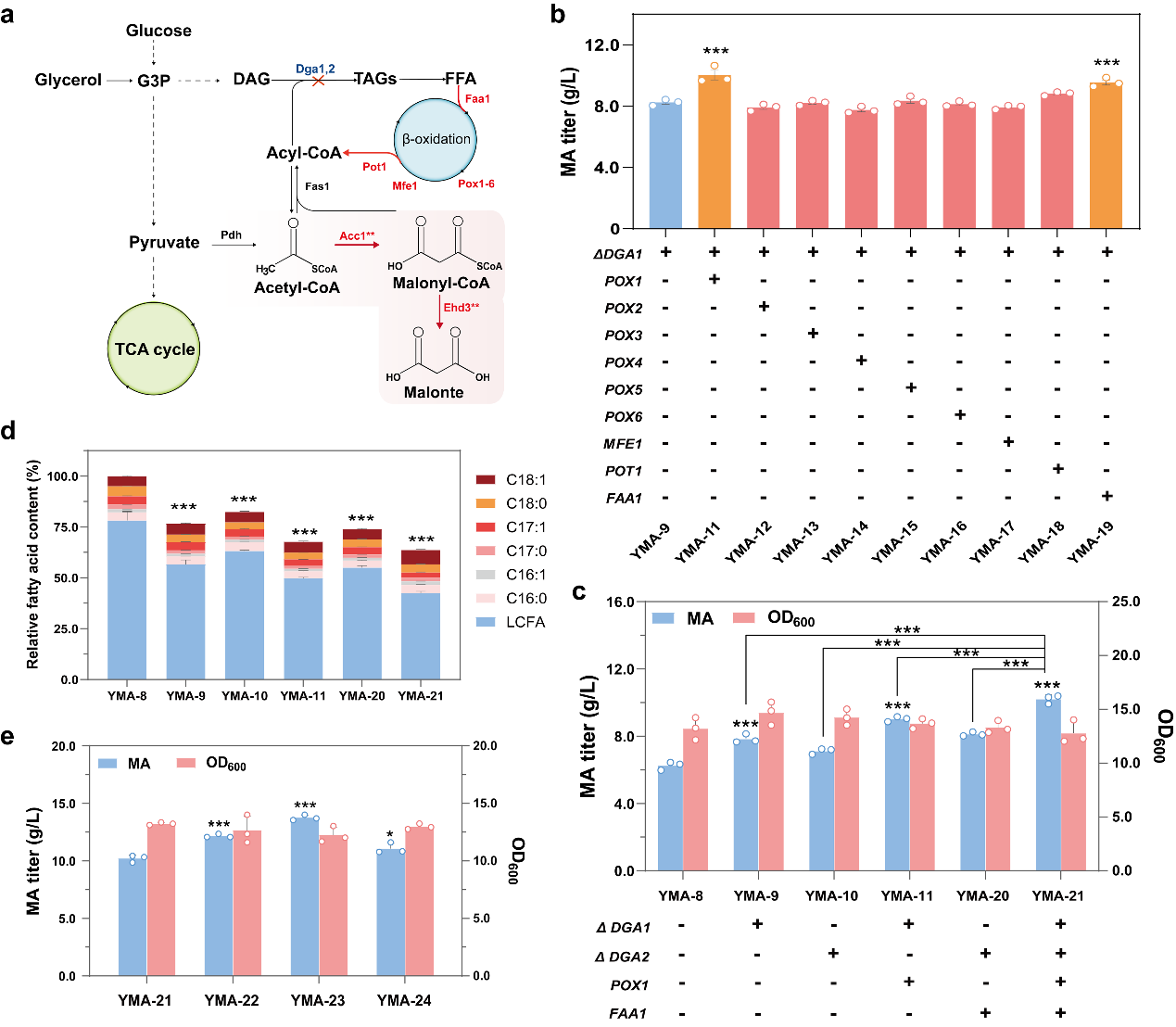 邓禹教授课题组选取耐酸性能力强、丙二酸前体丙二酰辅酶A高代谢通量的解脂耶氏酵母为底盘细胞,通过筛选丙二酸生物合成过程中的关键酶丙二酰辅酶 A 水解酶设计构建了基于丙二酰辅酶A途径合成丙二酸的工程菌株。首先,通过在解脂耶氏酵母中构建 3 种不同的合成途径评估了丙二酸合成能力,验证了来自酿酒酵母的丙二酰辅酶A水解酶Ehd3**途径效率最高。为进一步提升 MA 的产量,从解脂耶氏酵母和尖孢镰刀菌中鉴定出两种具有高催化活性的新型丙二酰辅酶 A 水解酶,其中表达尖孢镰刀菌丙二酰辅酶 A 水解酶FoEhd3**可使丙二酸产量提高至 6.3 g/L。随后,通过对工程菌株进行代谢改造,确保前体乙酰辅酶 A 和丙二酰辅酶A有充足的通量用于丙二酸的生产,在摇瓶培养中丙二酸产量达到 13.8 g/L。最后,通过优化发酵条件并在 5L 发酵罐中进行高密度发酵,以甘油为初始碳源,在初始培养基中甘油耗尽后,采用恒速进料策略,发酵156 h 时,丙二酸的最高产量达到 63.6 g/L,产率为 0.41 g/L/h。本研究为工程化解脂耶氏酵母生产丙二酸提供了一种绿色、高效的合成方法,为丙二酸的工业化生产提供了可能。