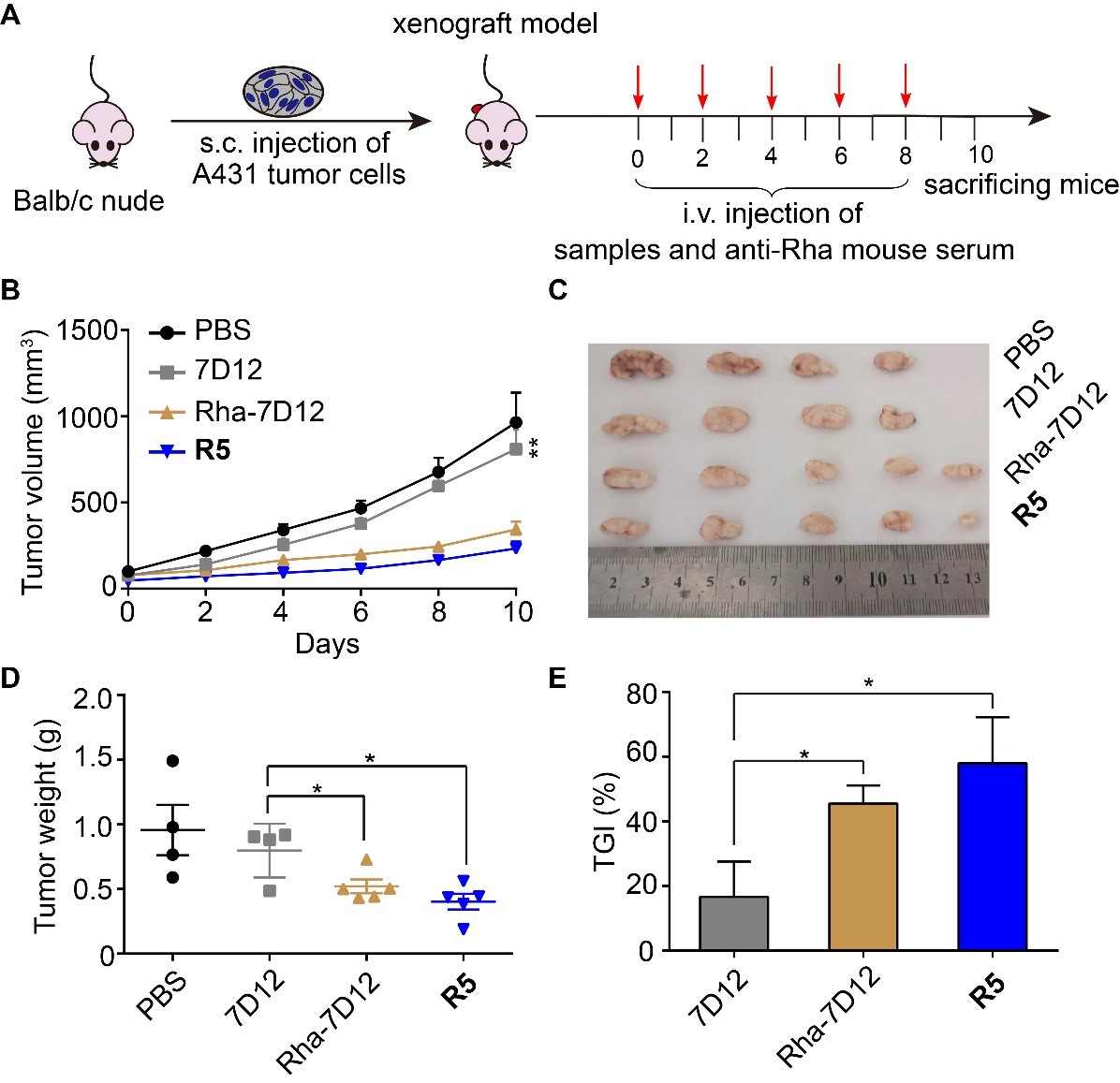 最后,在A431肿瘤的异种移植物小鼠模型中(图4),该研究发现偶联物R5对肿瘤的生长抑制效果最为明显,其肿瘤抑制率(TGI:60.0%)明显优于不带脂链的Rha-7D12偶联物(TGI:45.5%)、以及未进行任何修饰的7D12(TGI:16.3%)。上述研究结果表明鼠李糖脂修饰策略具有增强纳米抗体在癌症免疫疗法中疗效的潜力。