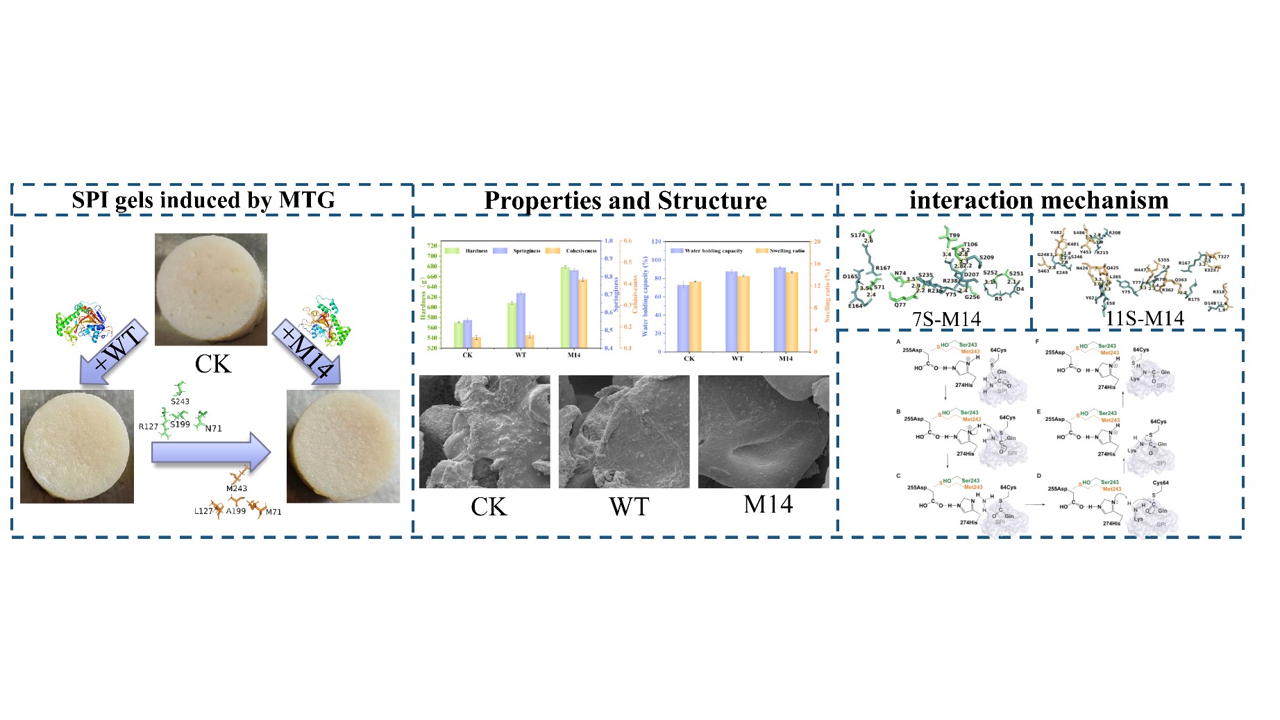 针对以上问题,我们开发了一种基于计算技术的空腔工程策略,以筛选出具有高催化活性和热稳定性的突变体。其中, N71M/S243M/S199A/R127L(M14)是比酶活得到显著提高的最优突变体,其比酶活 (354.40 U/mg)比野生型增加了14.45倍。同时,它的 Tm值增加了1.2℃,半衰期增长至62.6 min。结果表明,该突变体诱导形成SPI凝胶的各项理化性质(如质构特性、水合性质、流变性、热稳定性等)都有了明显提升。通过扫描电子显微镜(SEM)可以观察到,改性后的大豆分离蛋白凝胶有着更加致密且规则的网状结构。由分子动力学(MD)模拟可以看出,突变体M14的M71和M243残基使得所形成的复合物结合更加稳定。这些发现在拓宽SPI凝胶在食品的制造和加工应用方面起到了重要作用。