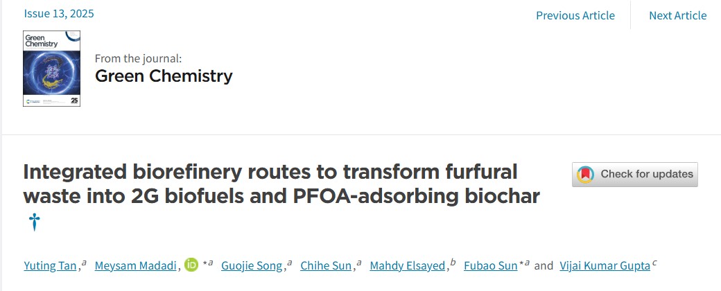 生物资源与生物炼制研究团队在糠醛渣生产加工的纤维类副产物增值利用方面取得重要进展,研究成果“Integrated biorefinery routes to transform furfural waste into 2G biofuels and PFOA-adsorbing biochar”正式发表于Green chemistry(一区, Top, IF 9.3)。