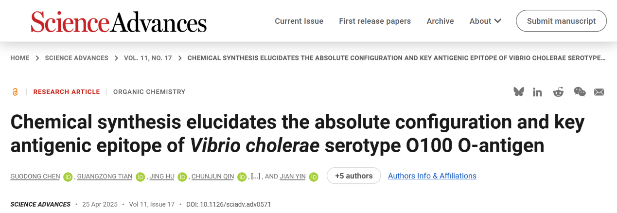 、糖化学与生物技术教育部重点实验室尹健教授团队在致病菌糖链抗原的全合成及抗原性研究方面取得新进展,研究成果“Chemical Synthesis Elucidates the Absolute Configuration and Key Antigenic Epitope of Vibrio cholerae Serotype O100 O-Antigen”发表于Science Advances(//doi.org/10.1126/sciadv.adv0571)。