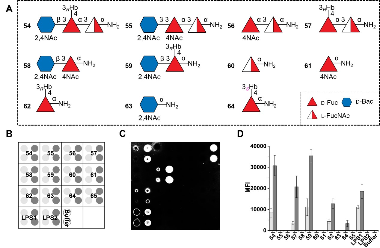 为了阐明O-抗原糖链的构效关系,尹健教授团队进一步合成了11种寡糖片段,并采用糖芯片技术对其抗原活性进行了系统评估(图3)。糖芯片筛选结果显示,RHb是该O-抗原中决定抗原表位的关键结构单元,而dHh修饰则未表现出显著作用。值得注意的是,二糖59(β-D-BacpNAc4NAc-α-D-Fucp4N(RHb))展现出优异的抗原活性,被鉴定为潜在的最小抗原表位。上述研究结果为霍乱弧菌合成糖缀合物疫苗的研发奠定了重要的理论基础。