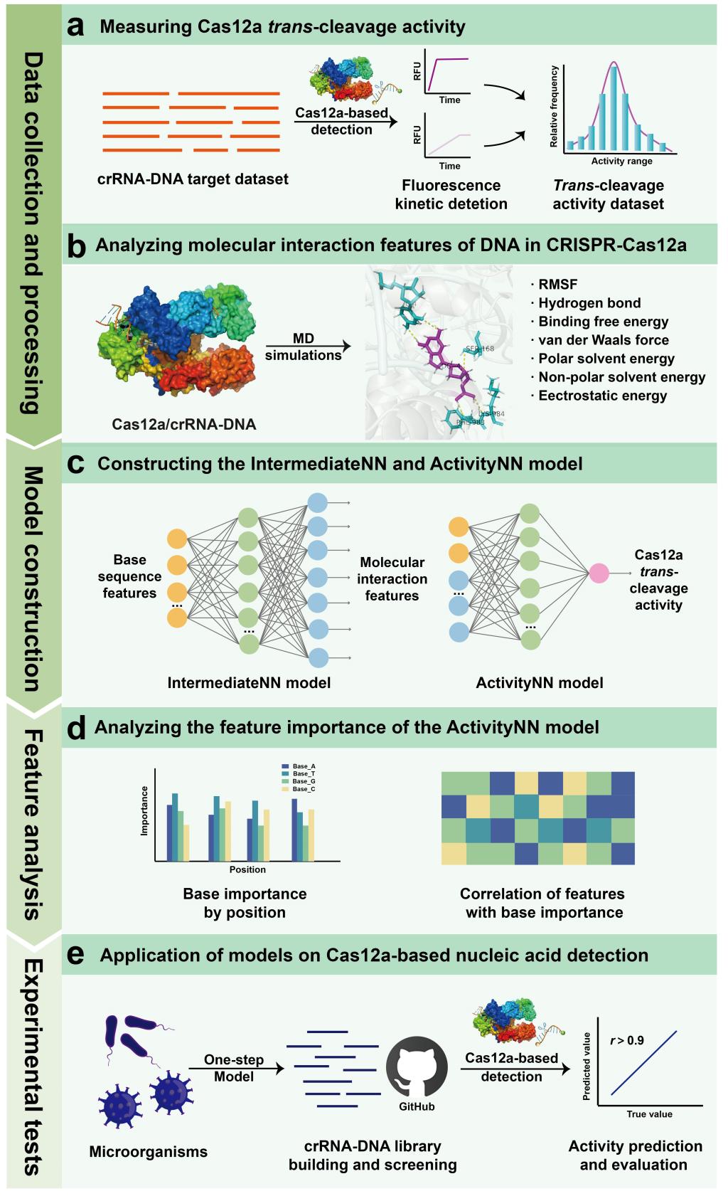 传统的crRNA设计依赖于经验性与试错性实验分析,既费时又耗资源。为了解决这一问题,吴群教授和聂尧教授等人提出了一种结合分子动力学模拟和神经网络模型的新方法来预测不同crRNA的Cas12a反式切割活性。该方法整合了CRISPR-Cas12a系统中DNA的序列特征和分子相互作用特征,显著提高了预测准确性(R2 = 0.9455)。通过特征值重要性分析,确定了影响Cas12a反式切割活性的关键序列特征。此外,该研究还建立了一个针对细菌、真菌、病毒等446个物种的crRNA序列文库,该文库可用于446个物种的CRISPR-Cas12a系统体外核酸检测(预测准确性Pearson’s r = 0.9328)。这项研究阐明了Cas12a/crRNA-DNA的分子相互作用机制,将促进CRISPR-Cas12a系统在快速核酸诊断中的应用。
