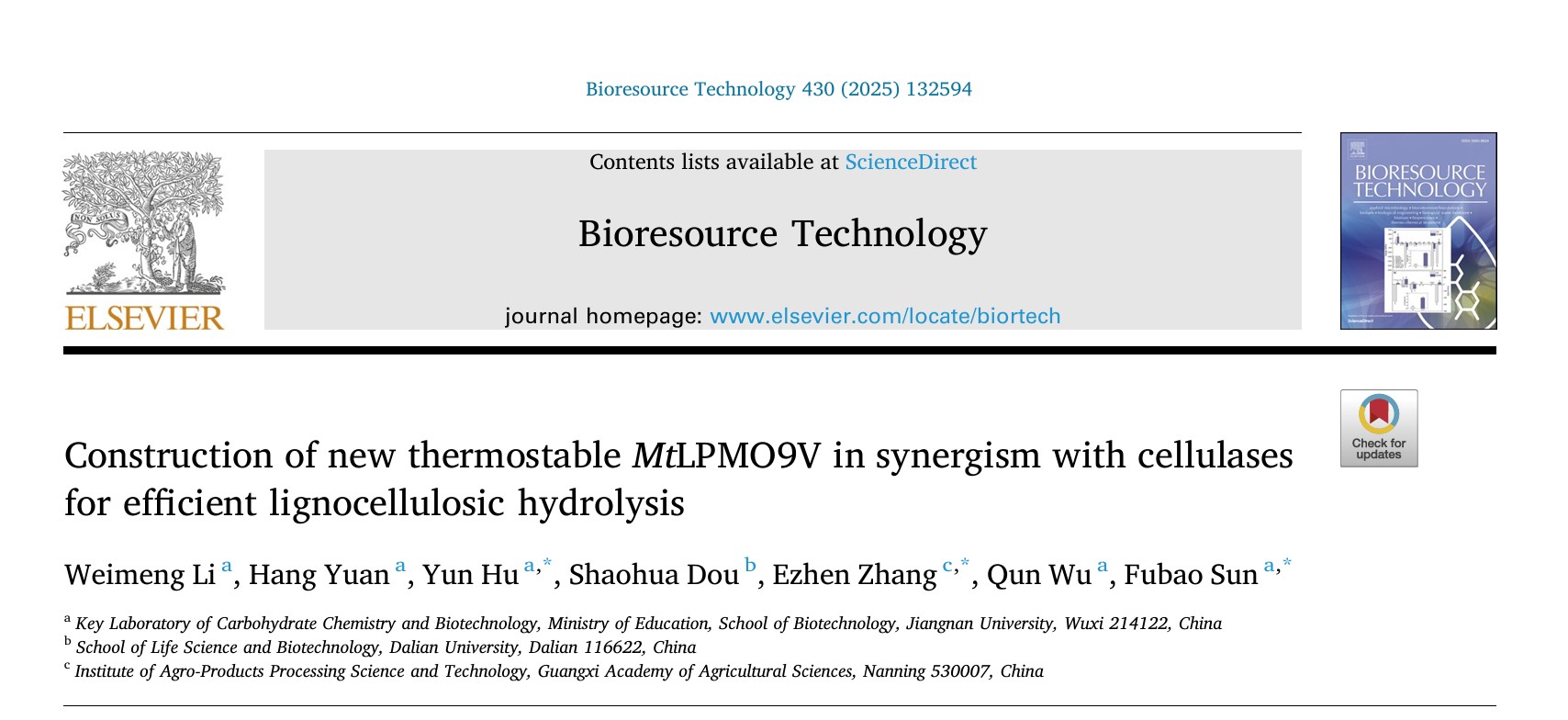 生物资源与生物炼制孙付保教授团队通过对AA9家族LPMO酶进行挖掘与改造,在提升纤维素水解效率方面取得重要进展,研究成果“Construction of new thermostable MtLPMO9V in synergism with cellulases for efficient lignocellulosic hydrolysis”正式发表于Bioresource Technology(一区, Top, IF 9.7)。