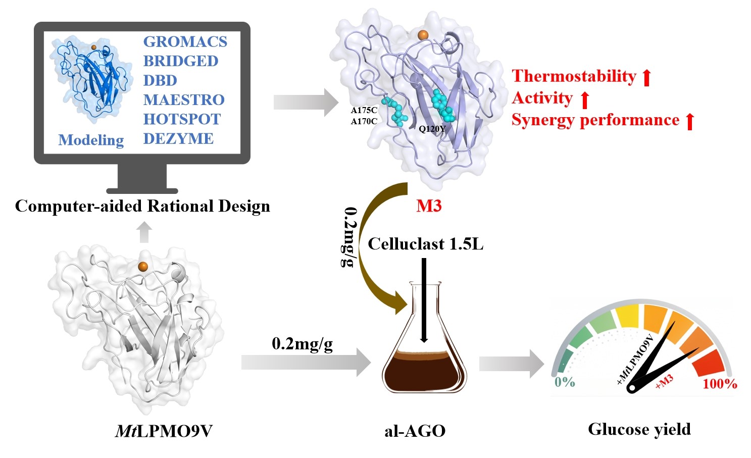 裂解多糖单加氧酶(Lytic polysaccharide monooxygenases, LPMOs)能够通过破坏纤维素的结晶区来促进纤维素的水解。本研究聚焦于一种尚未被充分表征的嗜热真菌嗜热毁丝菌(Myceliophthora thermophila)来源的LPMO(MtLPMO9V),并研究其与纤维素酶协同作用以实现高效木质纤维素水解的潜力。在成功将MtLPMO9V在毕赤酵母(Pichia pastoris GS115)中表达后,通过HPAEC-PAD、MODEL-TOF MS和HPLC对其氧化解聚特性进行了表征,结果表明该酶具有C4氧化裂解活性。借助计算机辅助设计和分子动力学(MD)模拟,对MtLPMO9V的热稳定性和活性进行改造。其中,突变体A170C/A175C/Q120Y(M3)不仅表现出出色的热稳定性,同时具有更高的催化活性,相比野生型MtLPMO9V(WT)提高了89%,其催化效率(kcat/Km)大约是WT的1.90倍。M3展现出广泛的适用性,不仅与耐热内切葡聚糖酶DtCelA协同作用,能够高效地在高温下对纤维素底物进行糖化,而且在与商业纤维素酶Celluclast 1.5L(其中LPMO仅占纤维素酶混合物的2%-4%)协同水解纤维质底物时,可将葡萄糖产率提高40%。进一步研究表明,通过两步法发挥耐热酶的性能,纤维质底物的糖化效率可提高55%。本研究为开发新型耐热LPMOs提供了宝贵的见解,并展示了其在纤维素酶介导的木质纤维素生物炼制产业发展中的潜在应用价值。