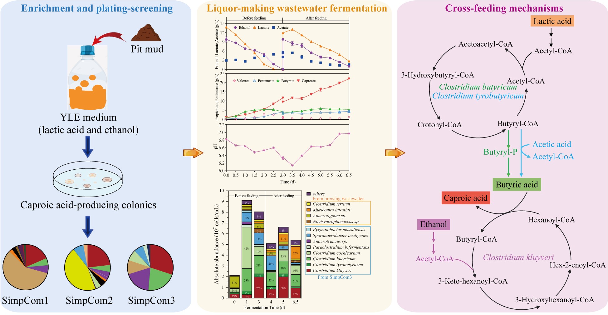 基于厌氧菌群定向精简技术,该课题组实现了白酒酿造副产物(富含乳酸与乙醇的酿造废水)中多种碳源的降解与己酸的高效合成,并揭示了主要功能微生物之间的交叉喂养机制。首先通过“Top-down”策略从浓香型白酒窖泥构建出产己酸精简菌群,并利用新一代宏基因组学技术解析了其物种构成;然后通过连续继代发酵测试,确认了构建的菌群具有良好的菌群结构稳定性与代谢稳定性;最后将精简菌群用于发酵酿造废水高效生产己酸。典型菌群SimpCom3 的高效产己酸能力源于群落内物种的协同作用:克氏梭菌(Clostridium kluyveri,相对丰度 30.69%-50.46%)、丁酸梭菌(C. butyricum,6.71%-13.98%)与酪丁酸梭菌(C. tyrobutyricum,37.11%-58.07%)为核心物种,通过反向β-氧化途径协同转化乳酸和乙醇生成己酸。更关键的是,因丁酸梭菌与酪丁酸梭菌转化乳酸为丁酸的过程为升pH式发酵,赋予了该精简群落具备自主 pH 调节能力,发酵过程中 pH 可稳定维持在 6.45-8.29 之间,发酵过程无需在线pH控制,大幅降低了工业应用成本。团队在 3 L 发酵罐中采用 fed-batch 发酵策略,发酵过程中,乳酸与乙醇同步利用,总短、中链脂肪酸产量 33.33 g/L,其中己酸为22.13 g/L,己酸产率提升至 3.4 g/L/d,且奇数链脂肪酸(丙酸、戊酸)生成量显著降低。