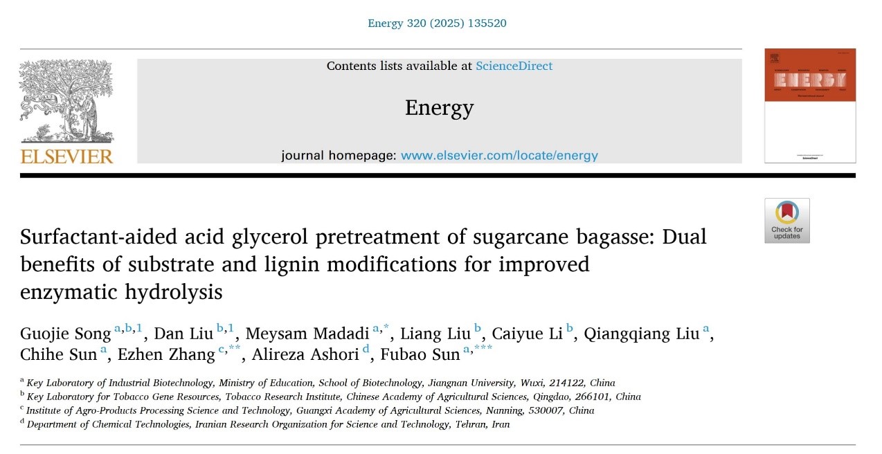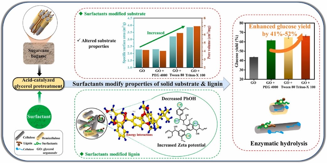 孙付保教授团队在研究先进预处理方法促进纤维质原料水解制糖方面取得重要进展,研究成果“Surfactant-aided acid glycerol pretreatment of sugarcane bagasse: Dual benefits of substrate and lignin modifications for improved enzymatic hydrolysis”正式发表于Energy (一区, Top, IF=9.4)。